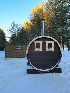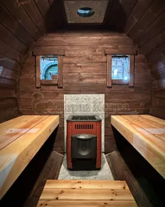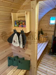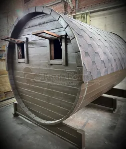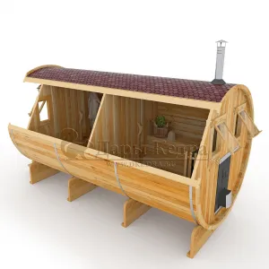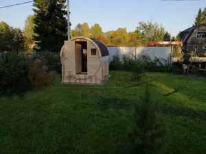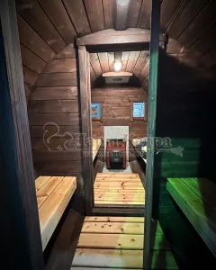 Это изделие круглой вытянутой формы с двумя отделениями: раздевалкой и парной. Лавочки из кедра находятся по всей длине бани-бочки с обеих сторон. Печь расположена в парилке около дальней стены. Для удобства пользования в раздевалке установлена вешалка и полочка из кедра. За счет небольшой конструкции баня нагревается не более 30 минут. По вашему желанию баню-бочку можно дополнить печью с внешней загрузкой, благодаря которой весь мусор после топки останется на улице. Круглая баня-бочка не требует полноценный фундамент, поэтому при необходимости ее можно перенести в другое место.
