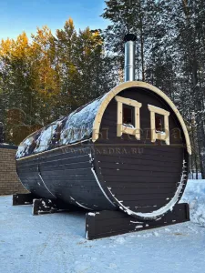 Это изделие круглой вытянутой формы с тремя отделениями: раздевалкой, моечной и парной. Во всех трех отделениях с обеих сторон установлены лавочки из кедра. Печь находится в парилке около дальней стены. Для удобства пользования в бане висят полочки из кедра и вешалка в раздевалке. Время растопки такой бани не превышает 30 минут. По вашему желанию баню-бочку можно дополнить печью с внешней загрузкой, благодаря которой весь мусор после топки останется на улице. Круглая баня-бочка не требует полноценный фундамент, поэтому при необходимости ее можно перенести в другое место.