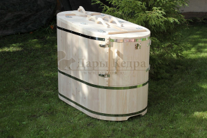 Кедровая фитобочка полулежачая - это мини парная, которую можно использовать не только в спа-салонах, но и дома. Модель этой бочки наиболее комфортна, так как позволяет принимать процедуры полулежа. Толщина стенок составляет 40-45 мм, что позволяет увеличить срок службы изделия. Фитобочка оборудована откидными створками, дверцей и отверстием для головы. Во время парения человек находится внутри кедровой бочки, а голова снаружи. Благодаря этому исключается возможность перегрева. Подлокотники, подспинник из кедра и внутренние ручки делают эксплуатацию фитобочки более удобной.
