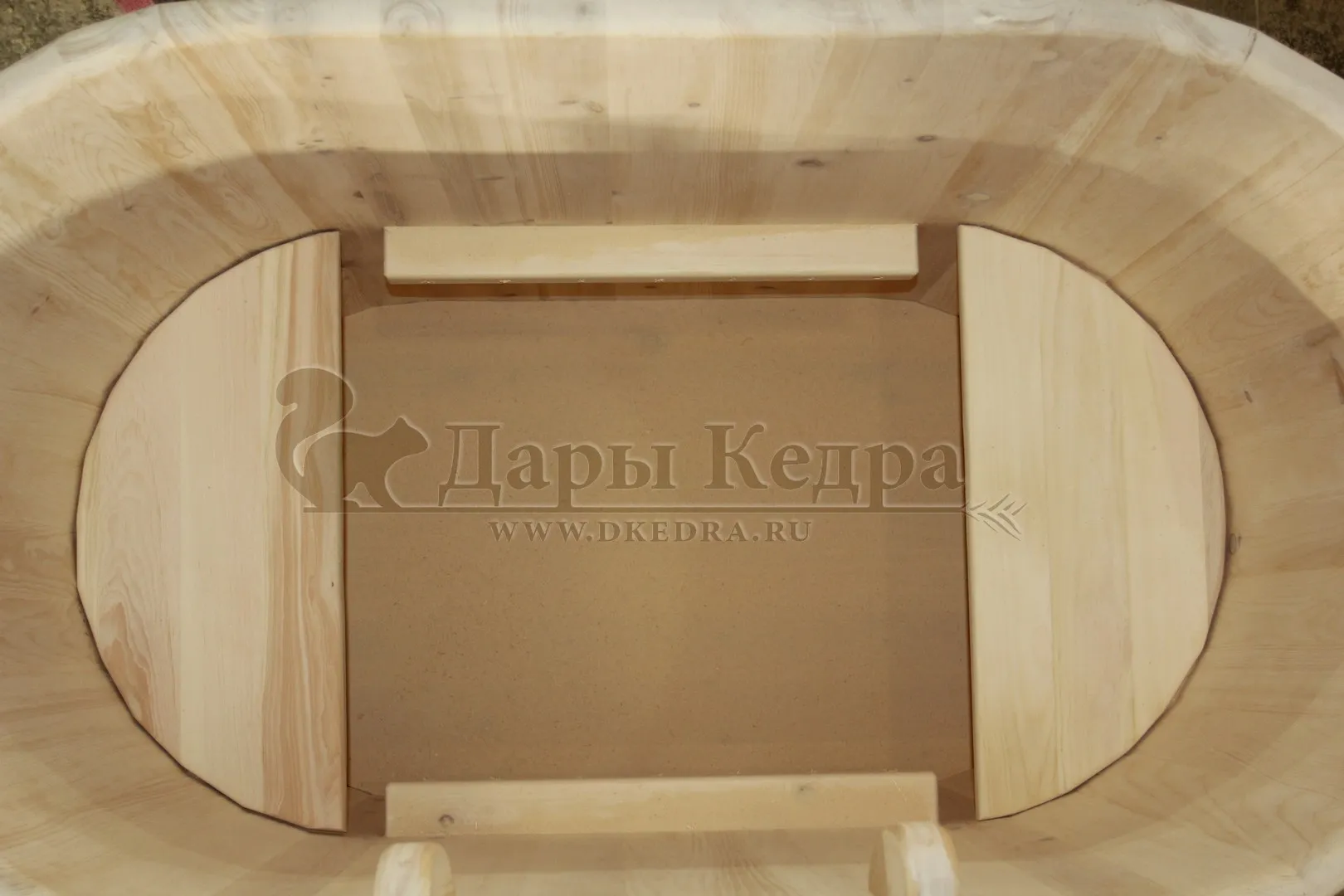 Форма овальной фурако допускает разное расположение сидений, просим Вас при заказе согласовывать свои пожелания с менеджером, так как данный момент влияет на размещение лестницы. В стандартной комплектации лестница идёт по длинной стороне фурако, а форсунки для подачи горячей воды от внешней печи напротив, поэтому сиденья находятся слева и справа. Возможно боковое подключение печи с лестницей у короткой стенки и с сиденьями по длинной стороне фурако. Для круглогодичного использования изделия рекомендуем приобрести дополнительно циркуляционный насос, который ускорит нагревание воды зимой и термокрышку для сохранения тепла длительное время.