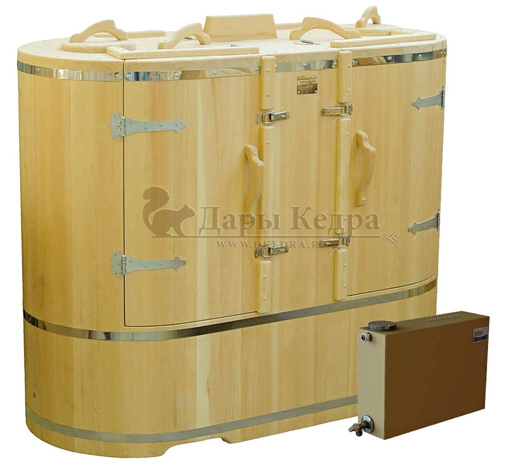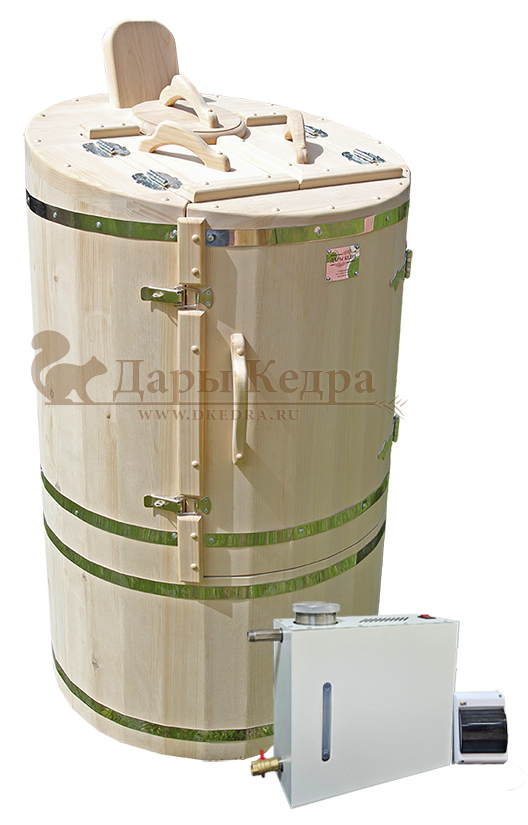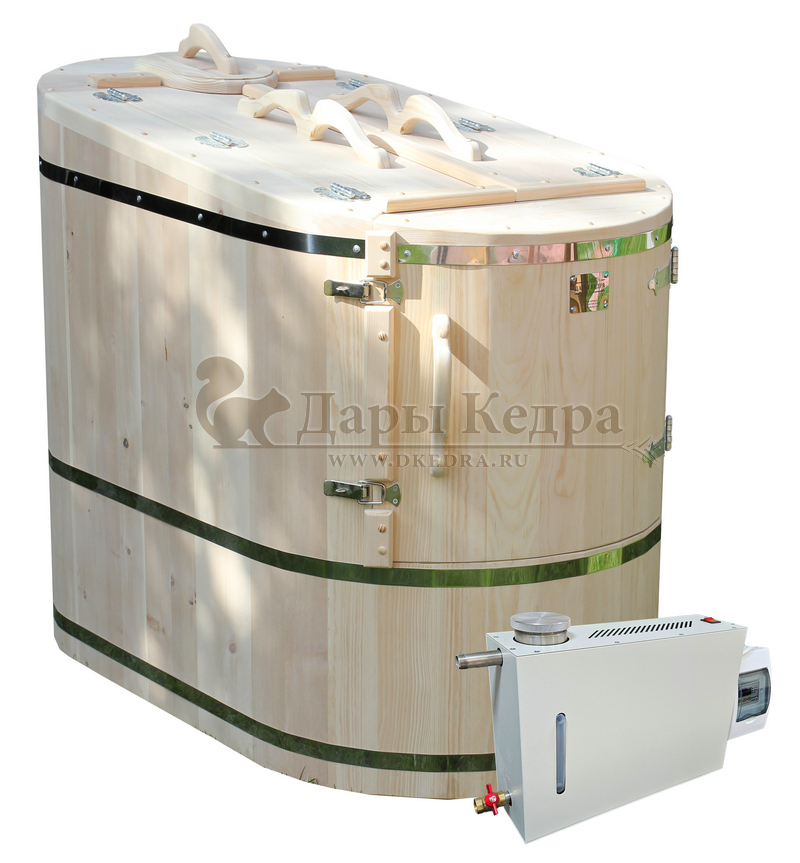 Готовый комплект «Универсальный»: кедровая бочка с парогенератором + био-защита изнутри и снаружи Готовый комплект - это полностью укомплектованный набор с фитобочкой для процедур парения. Овальная модель более просторна и удобна в использовании. Толщина стенок составляет 40-45 мм, что позволяет увеличить срок службы изделия. Верхний скос делает положение головы более комфортным и улучшает обзор. Фитобочка оборудована откидными створками, дверцей и отверстием для головы. Во время парения человек сидит внутри кедровой бочки, а голова находится снаружи. Благодаря этому исключается возможность перегрева. Подлокотники из кедра, встроенные ручки на створках и двери делают эксплуатацию более удобной. Парение в фитобочке благотворно влияет на организм в целом: повышается иммунитет, выводятся шлаки и токсины, улучшается работа органов тела и состояние кожи.