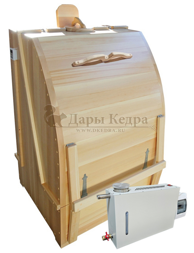 Готовый комплект «Домашний»: кедровая бочка с парогенератором + био-защита изнутри и снаружи Готовый комплект - это полностью укомплектованный набор с фитобочкой для процедур парения. Круглая модель наиболее компактна и мобильна. Толщина стенок составляет 25 мм. Фитобочка оборудована откидными створками, дверцей и отверстием для головы. Верхний скос изделия делает положение головы более комфортным и улучшает обзор. Во время парения человек сидит внутри кедровой бочки, а голова находится снаружи. Благодаря этому исключается возможность перегрева. Подлокотники из кедра, встроенные ручки на створках и двери делают эксплуатацию более удобной. Парение в фитобочке благотворно влияет на организм в целом: повышается иммунитет, выводятся шлаки и токсины, улучшается работа органов тела и состояние кожи.