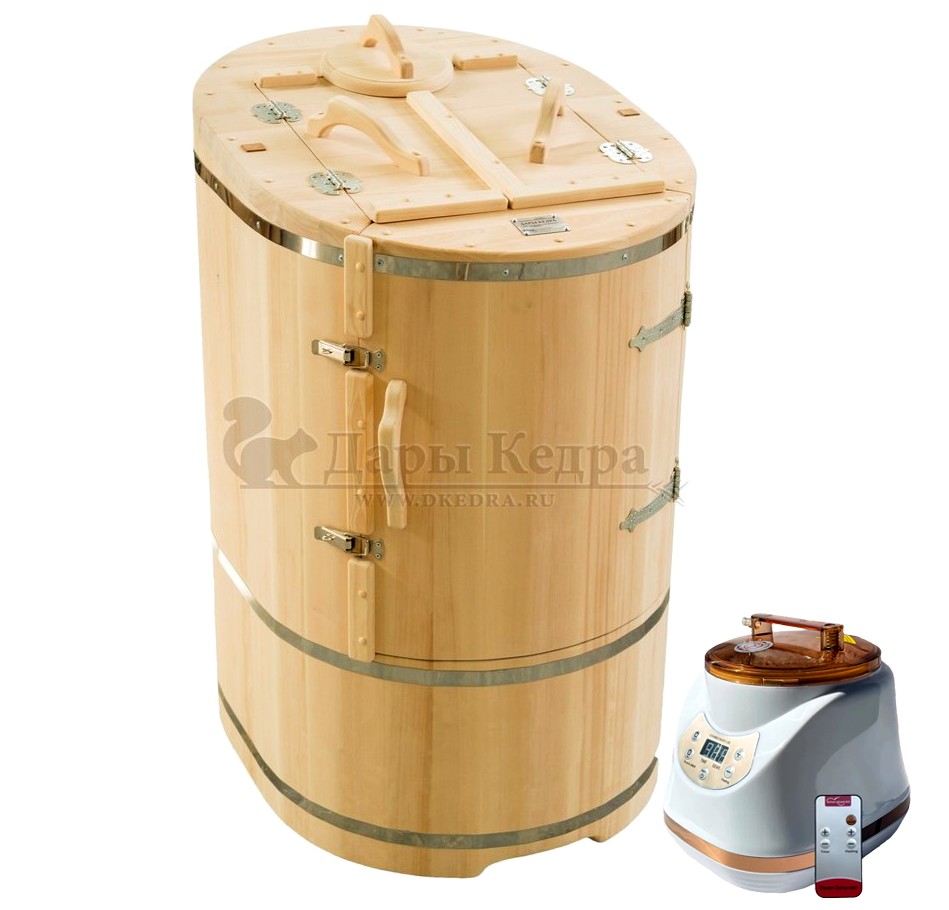 Готовый комплект «Удобный»: кедровая бочка с парогенератором + био-защита изнутри и снаружи Готовый комплект - это полностью укомплектованный набор с фитобочкой для процедур парения. Овальная модель более просторна и удобна в использовании. Толщина стенок составляет 25 мм. Фитобочка оборудована откидными створками, дверцей и отверстием для головы. Во время парения человек сидит внутри кедровой бочки, а голова находится снаружи. Благодаря этому исключается возможность перегрева. Подлокотники из кедра, встроенные ручки на створках и двери делают эксплуатацию более удобной. Парение в фитобочке благотворно влияет на организм в целом: повышается иммунитет, выводятся шлаки и токсины, улучшается работа органов тела и состояние кожи.