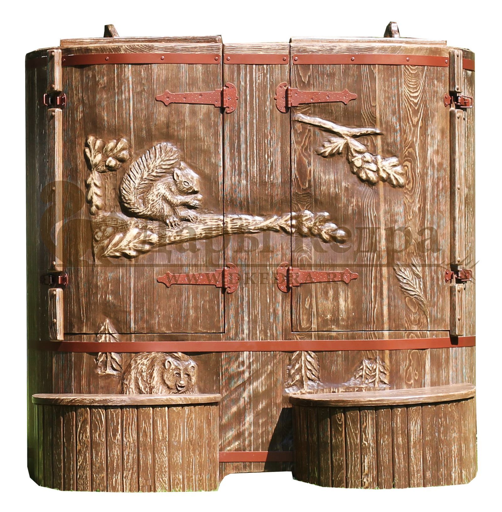 Кедровая бочка (фитобочка) «Сибирская белка» Любая модель эксклюзивной фитобочки - это выбор не только дизайнеров и ценителей красоты, но и тех, кто любит нестандартный подход в любых деталях. С оригинальной авторской фитобочкой Дары Кедра ваша квартира, дом или салон красоты станут объектом всеобщего внимания, ведь такая фитобочка - это не просто смело, красиво и достойно, это еще и очень полезно для Вашего здоровья! Художественная резьба это ручная работа, выполняется разными мастерами и каждый рисунок неповторим. Вы можете выбрать предложенные варианты резьбы или подобрать изображение и мы предложим вам подходящий эскиз. На сайте представлены наши работы в качестве примера. Каждая резьба рассчитывается индивидуально и может быть нанесена на любую модель фитобочки. Эксклюзивная фитобочка может быть представлена в разной цветовой гамме: После того, как цвет фитобочки выбран, необходимо определиться с вариантом резьбы (или предложить свой): Фитобочку можно также декорировать канатной веревкой в места обручей из нержавеющей стали (оплачивается дополнительно).