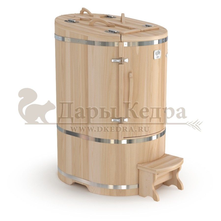 • Кедровая бочка (фитобочка) овальная со скосом «Классическая» Овальная фитобочка из кедра - это мини парная, которую можно использовать не только в спа-салонах, но и дома. Овальная модель более просторна и удобна в использовании. Толщина стенок составляет 25 мм. Верхний скос делает положение головы более комфортным и улучшает обзор. Она оборудована откидными створками, дверцей и отверстием для головы. Во время парения человек сидит внутри кедровой бочки, а голова находится снаружи. Благодаря этому исключается возможность перегрева. Подлокотники из кедра, встроенные ручки на створках и двери делают эксплуатацию более удобной. Парение в фитобочке благотворно влияет на организм в целом: повышается иммунитет, выводятся шлаки и токсины, улучшается работа органов тела и состояние кожи.