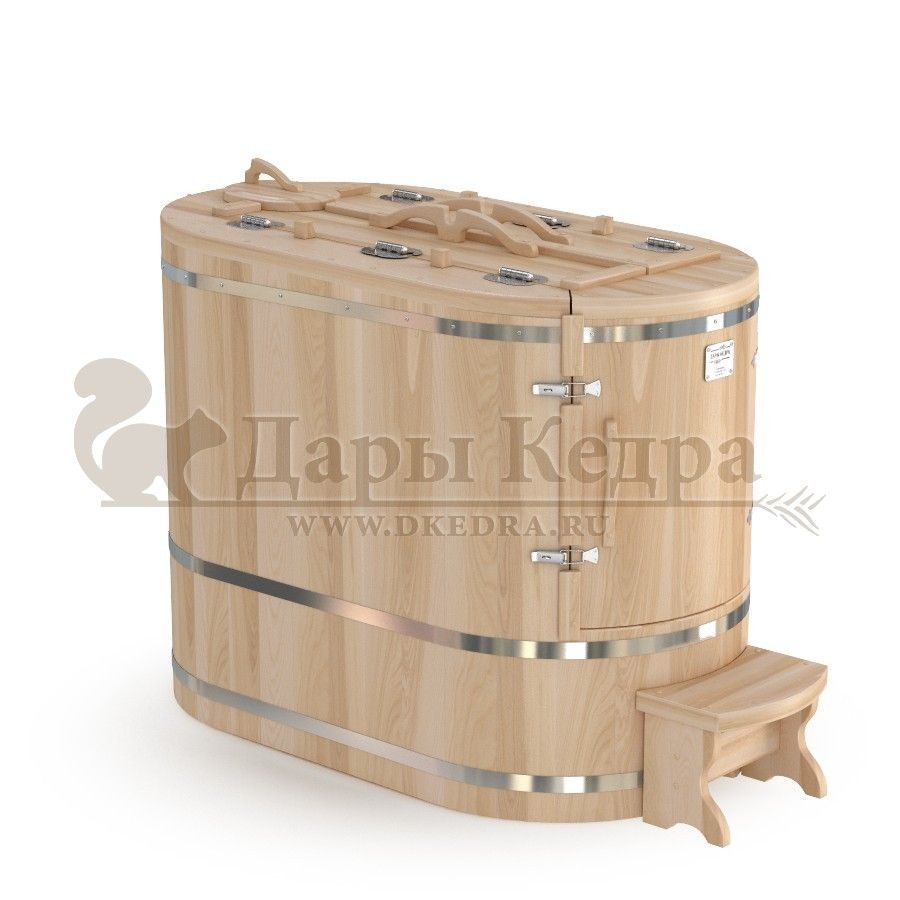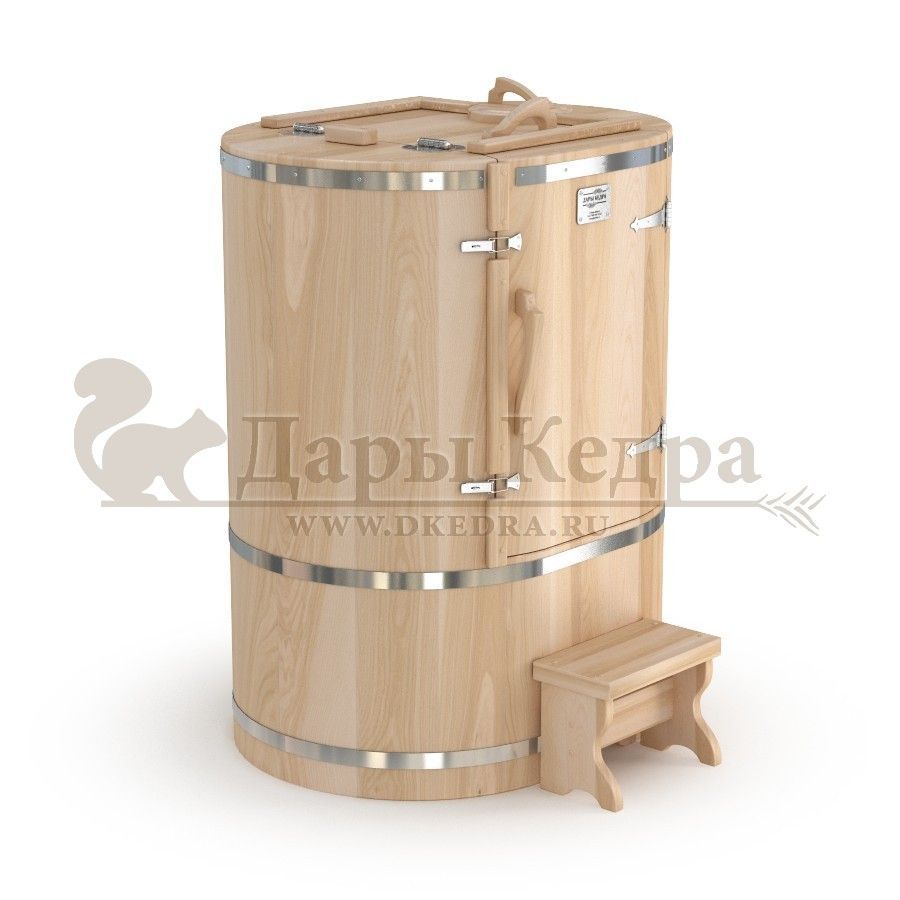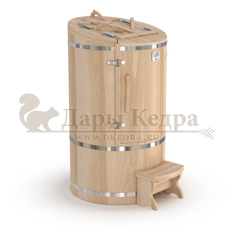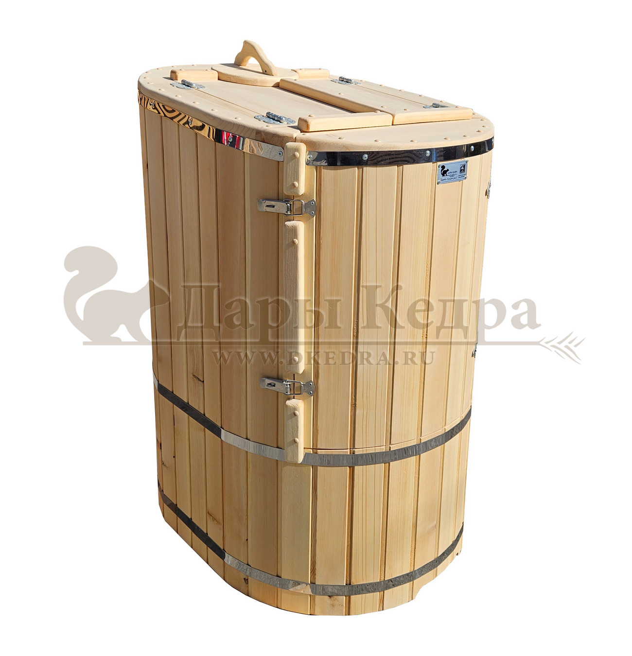 • Кедровая бочка (фитобочка) овальная «Классическая» Овальная фитобочка из кедра - это мини парная, которую можно использовать не только в спа-салонах, но и дома. Овальная модель более просторна и удобна в использовании. Толщина стенок составляет 25 мм. Она оборудована откидными створками, дверцей и отверстием для головы. Во время парения человек сидит внутри кедровой бочки, а голова находится снаружи. Благодаря этому исключается возможность перегрева. Подлокотники из кедра, встроенные ручки на створках и двери делают эксплуатацию более удобной. Парение в фитобочке благотворно влияет на организм в целом: повышается иммунитет, выводятся шлаки и токсины, улучшается работа органов тела и состояние кожи.
